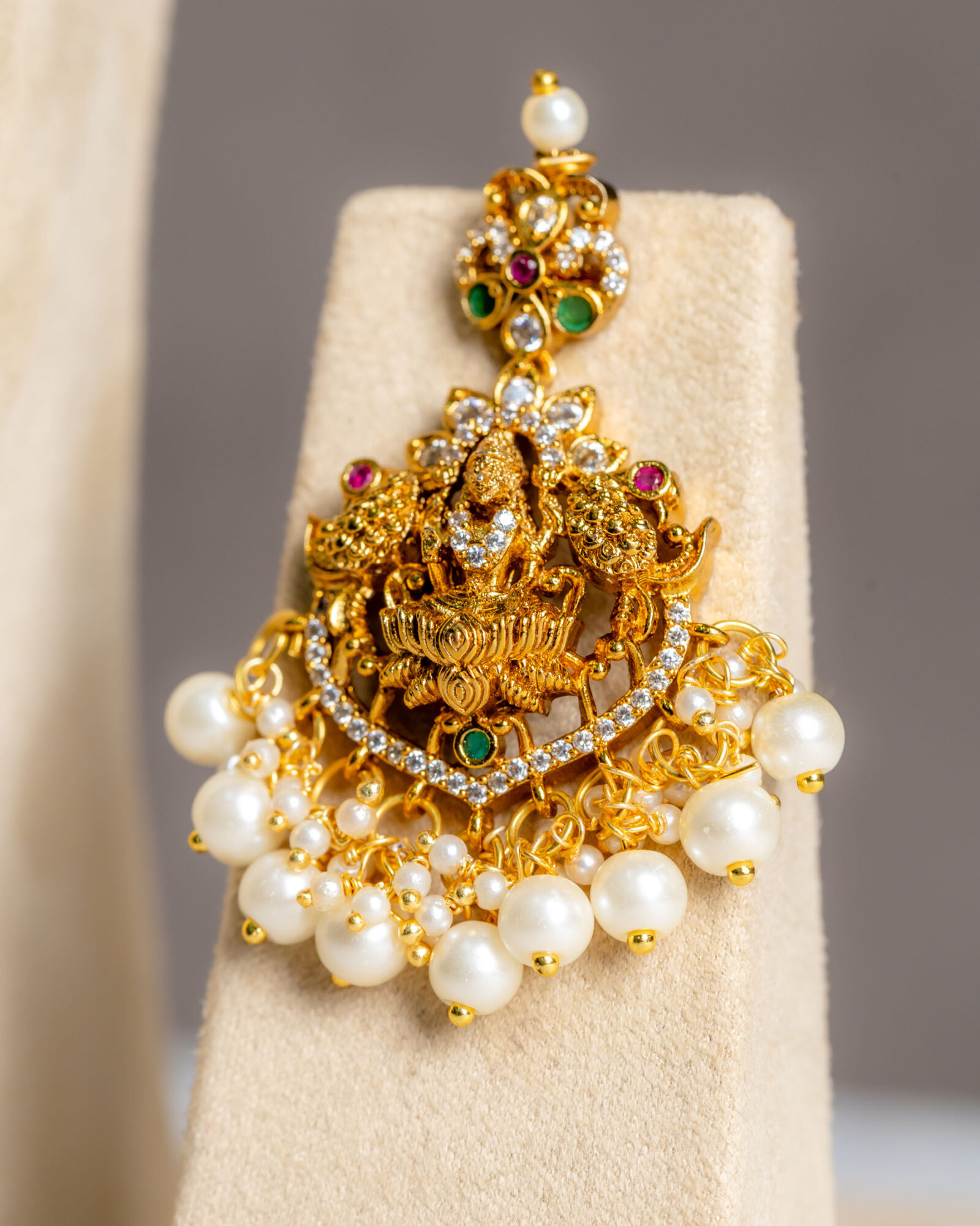 The Anusri Antique Necklace Set showcases a striking and elegant design that is bound to captivate. Crafted with premium CZ stones, this piece of Indian jewelry is ideal for special occasions, weddings, and festivals. If you’re seeking temple jewelry, Anusri is the perfect option. Its antique design blends traditional craftsmanship with contemporary style, making it a trendy and modern choice from the outset.