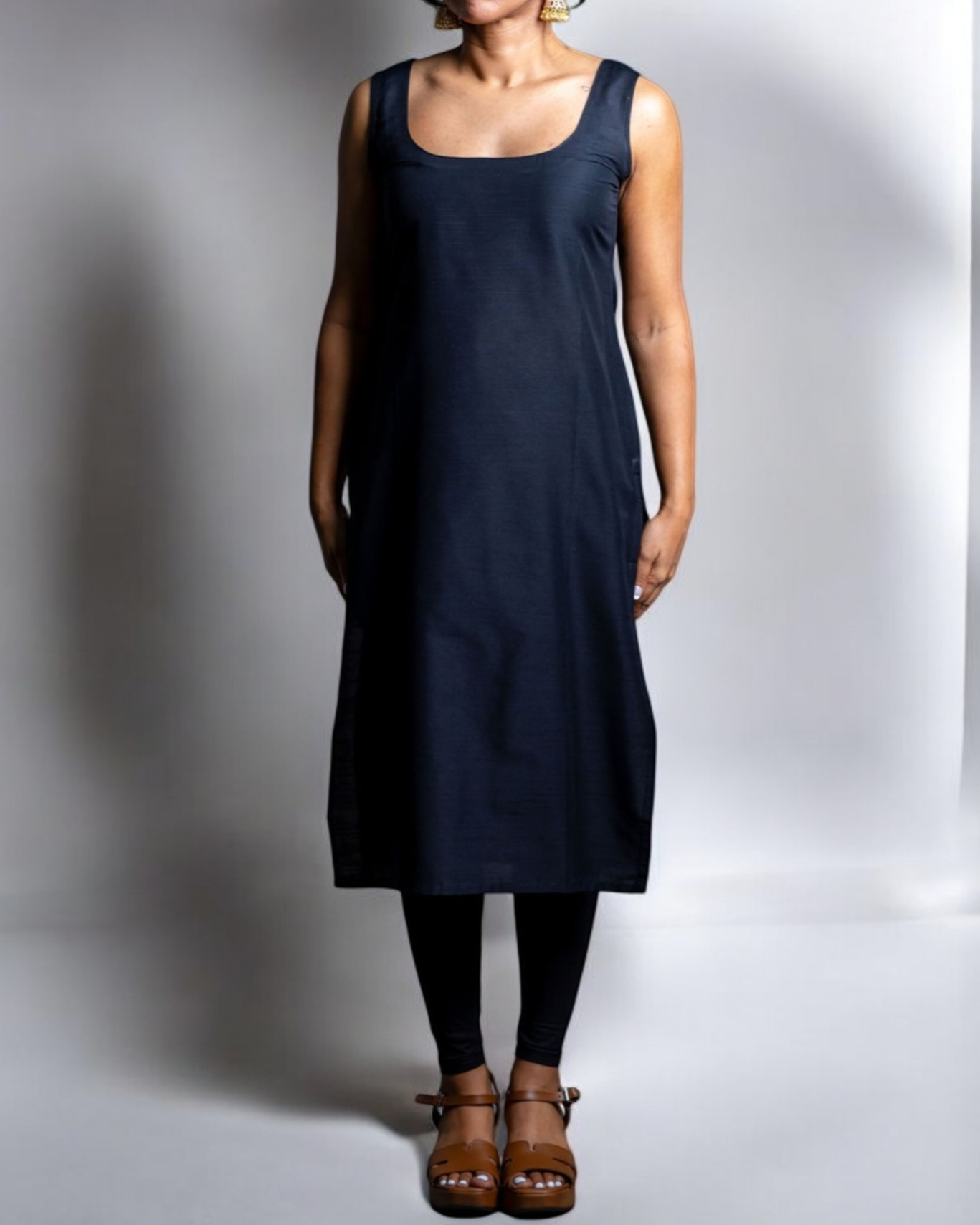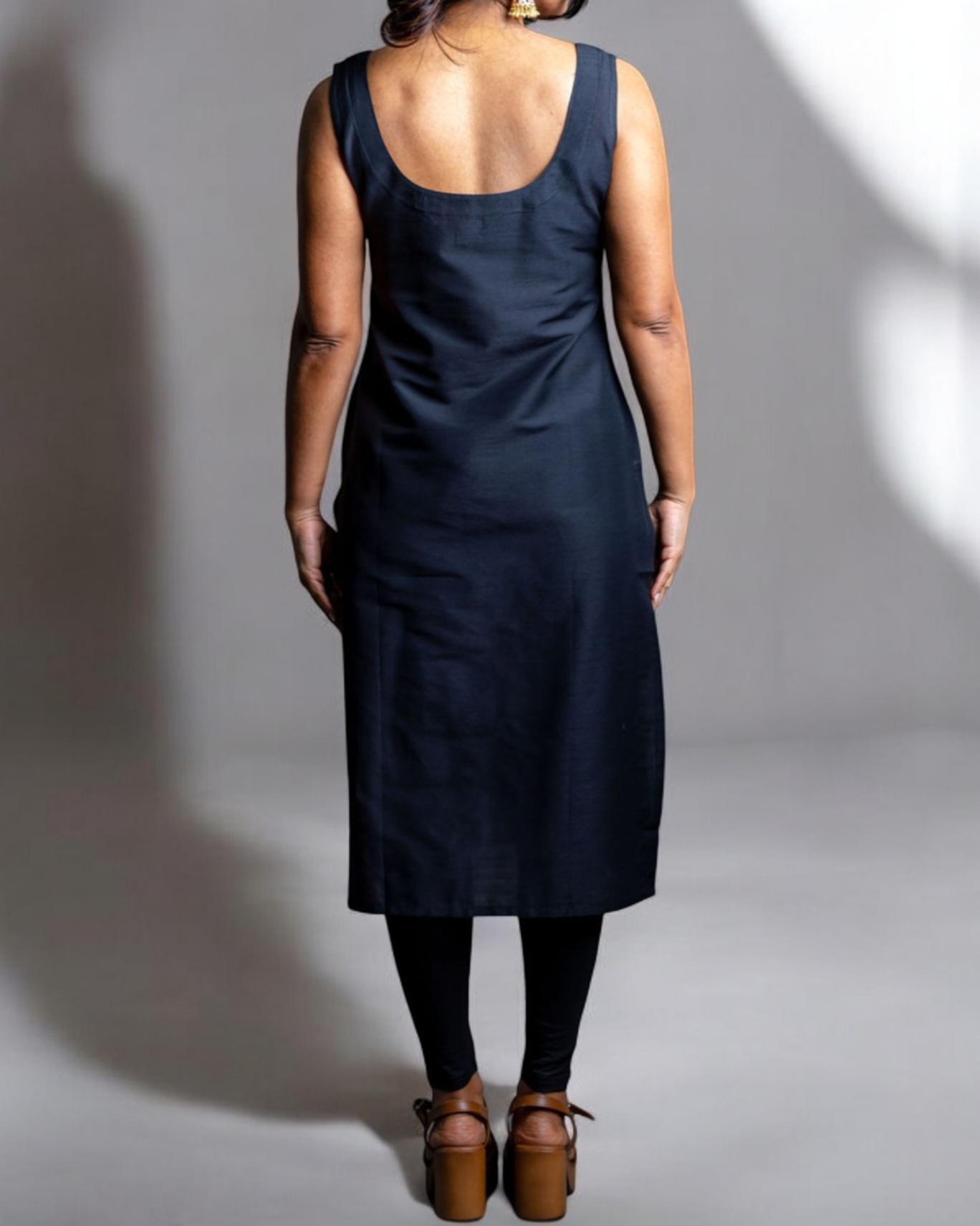 Black U-shape Neck Sleeveless Dupion Silk Long Kurti