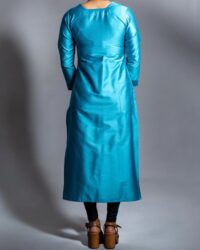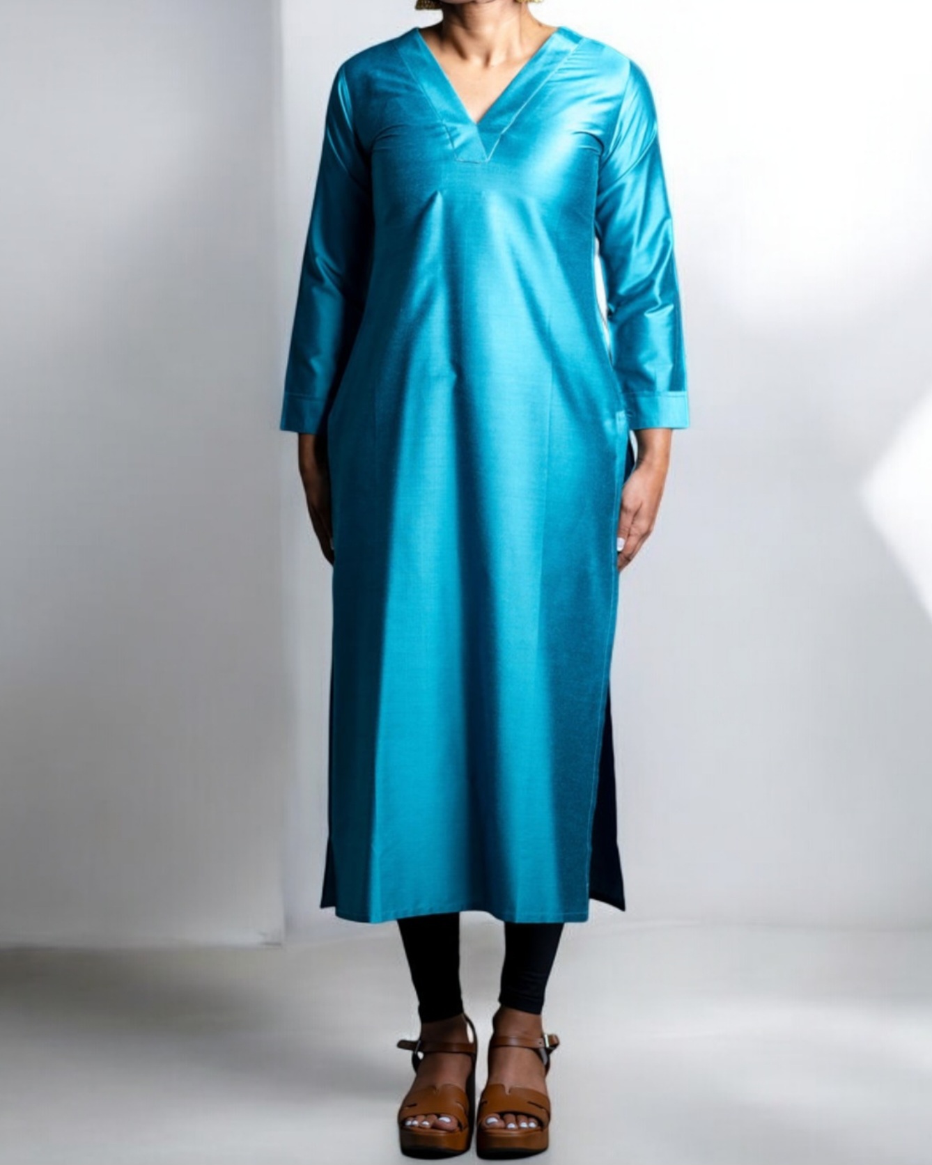Blue V-shape Neck Long Sleeve Dupion Silk Long Kurti