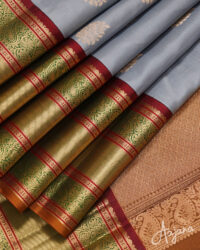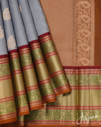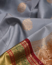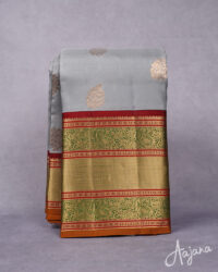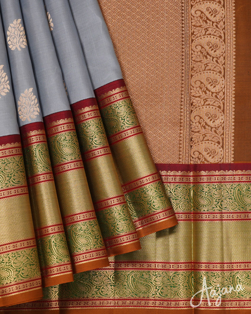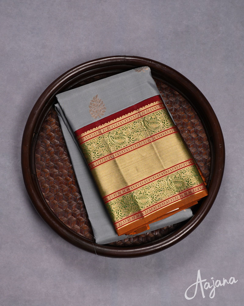 Pure Kanjivaram Silk Saree in Grey with Gold Zari Butta and Regal Multicolour Border
