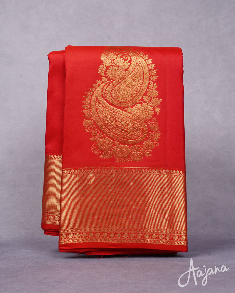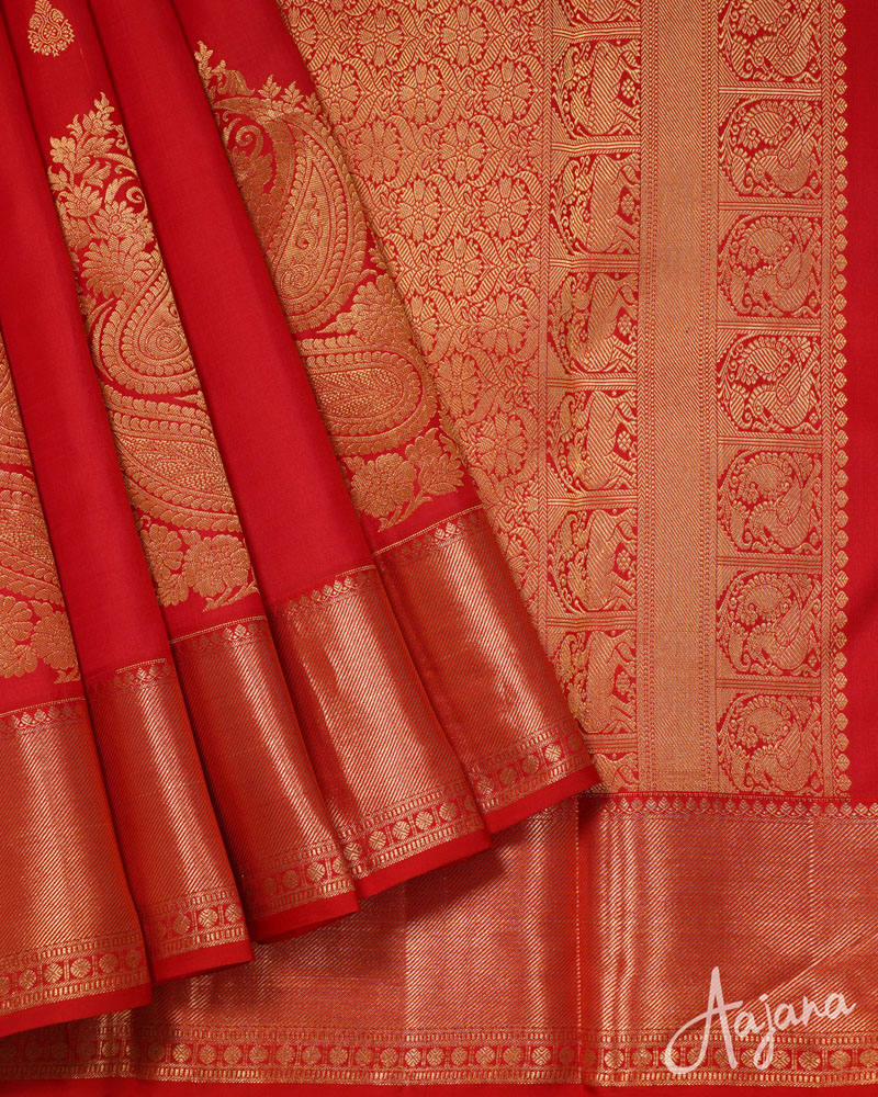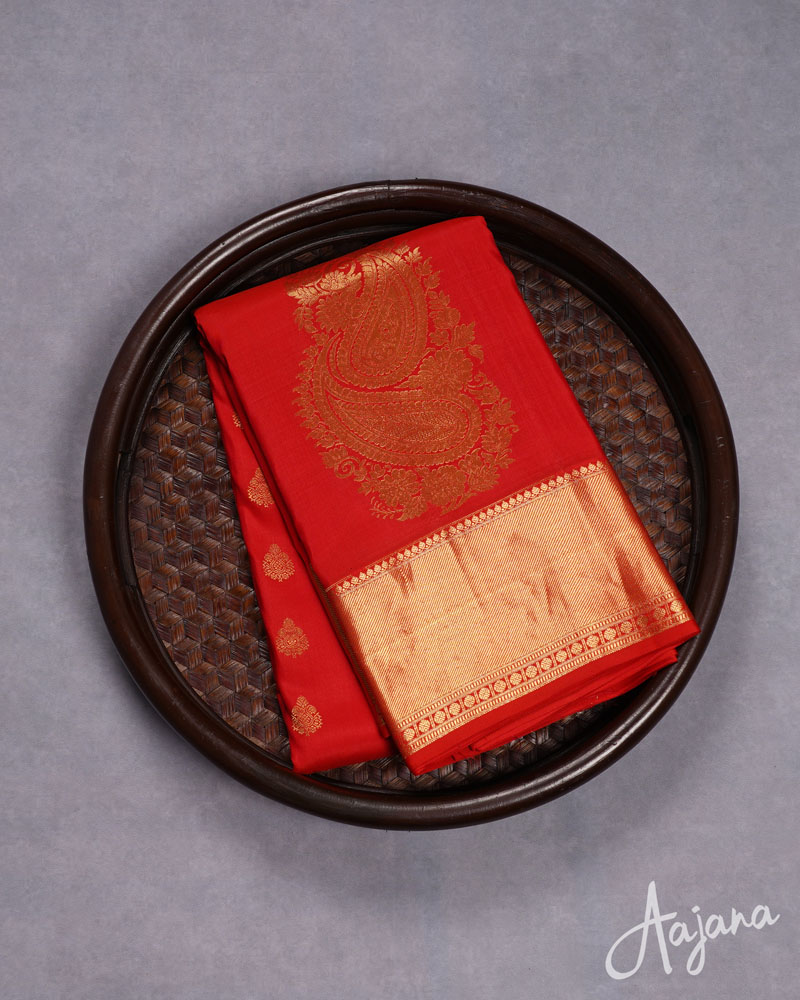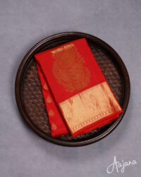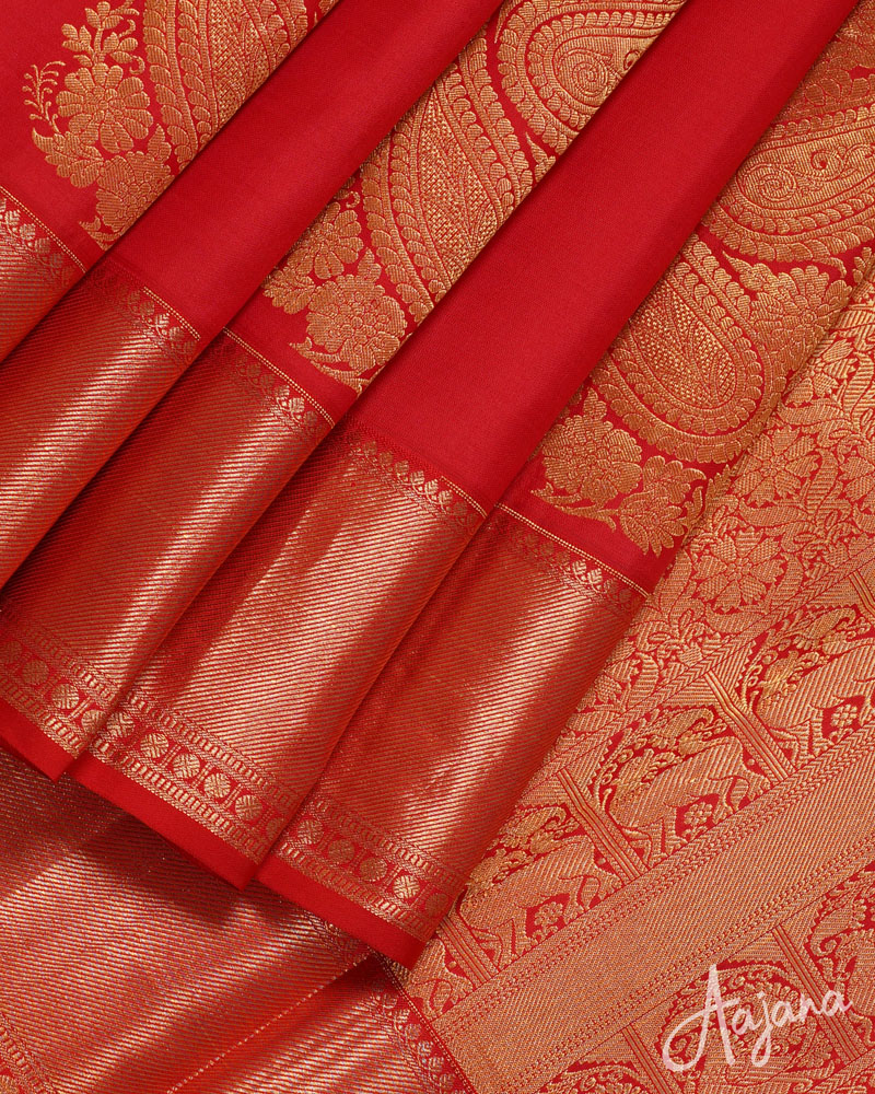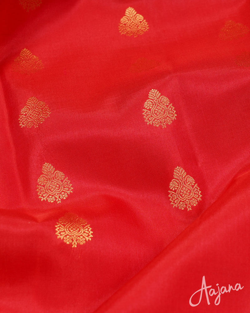 Pure Kanjivaram Silk Saree in Red with Gold Zari Motifs, Butta and Border