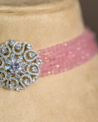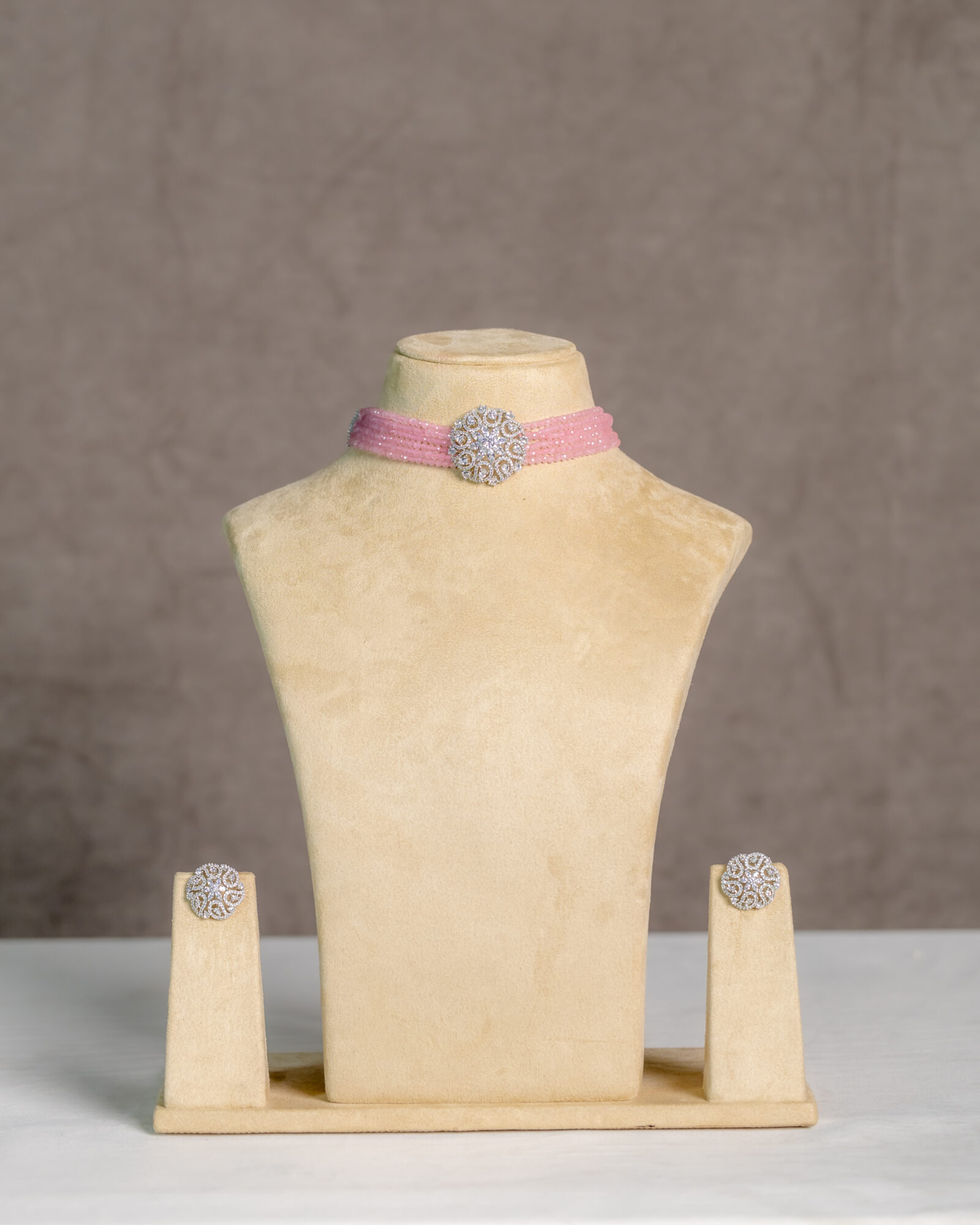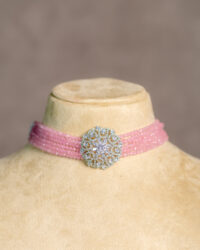 | This is a stunning pink choker set that comes with a pair of pretty stud earrings. The pair of earrings can be worn alone too, and would match with many Indian and Western outfits effortlessly. |