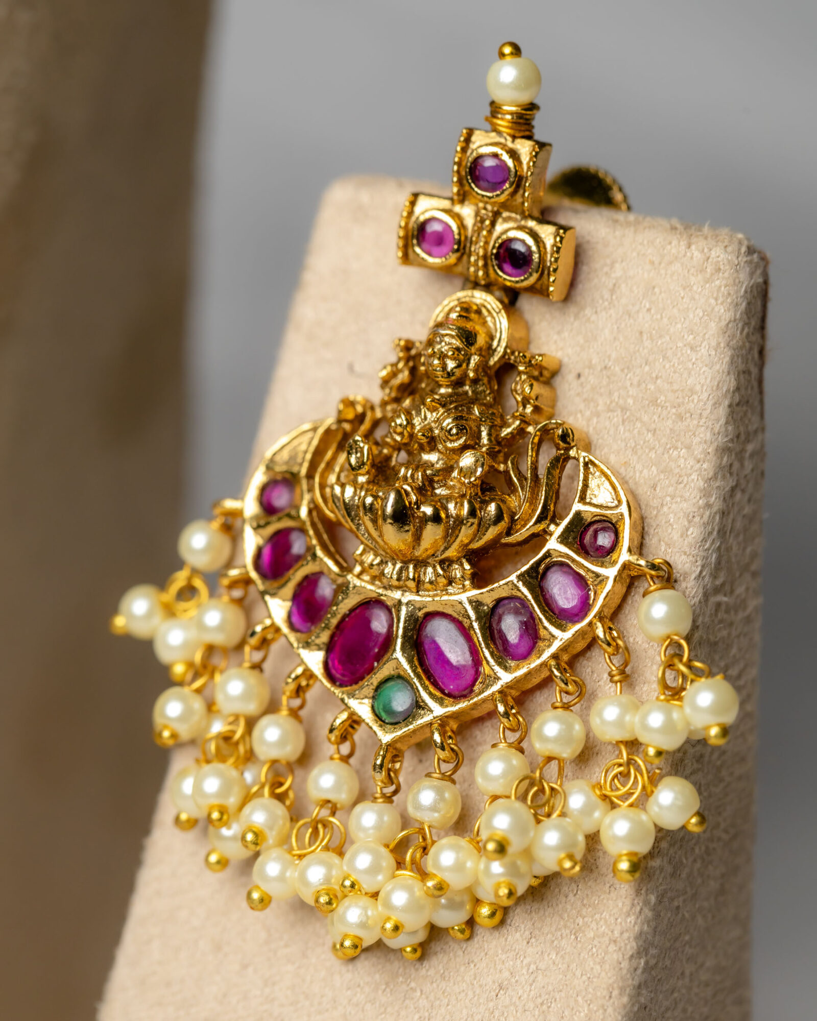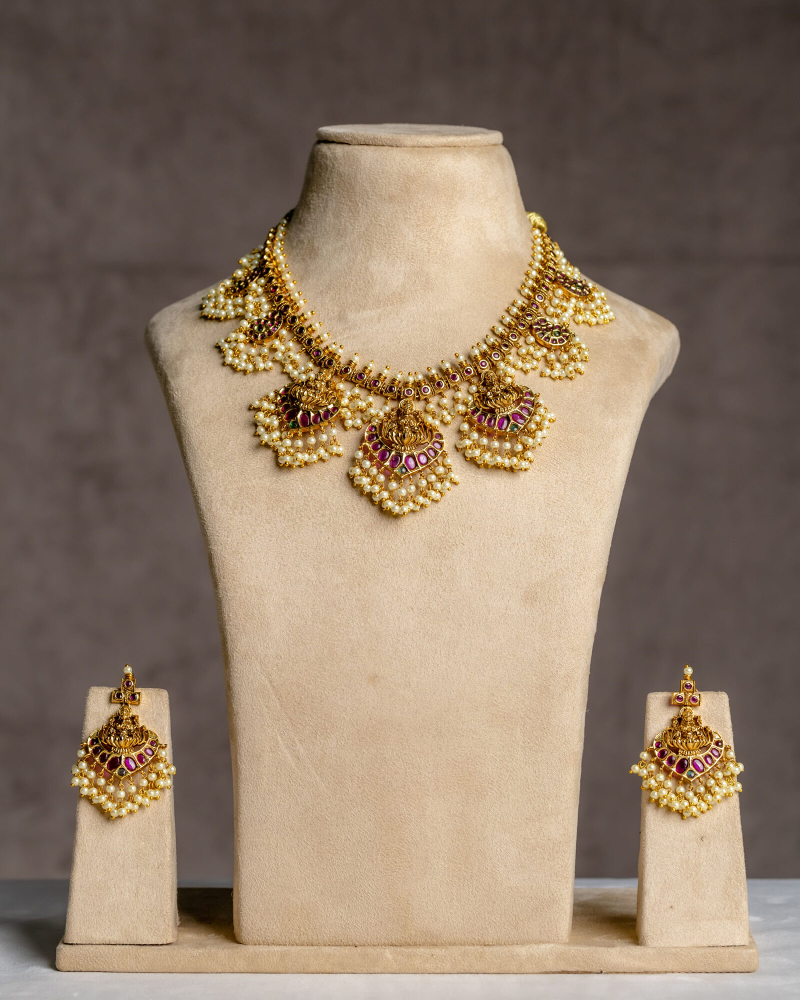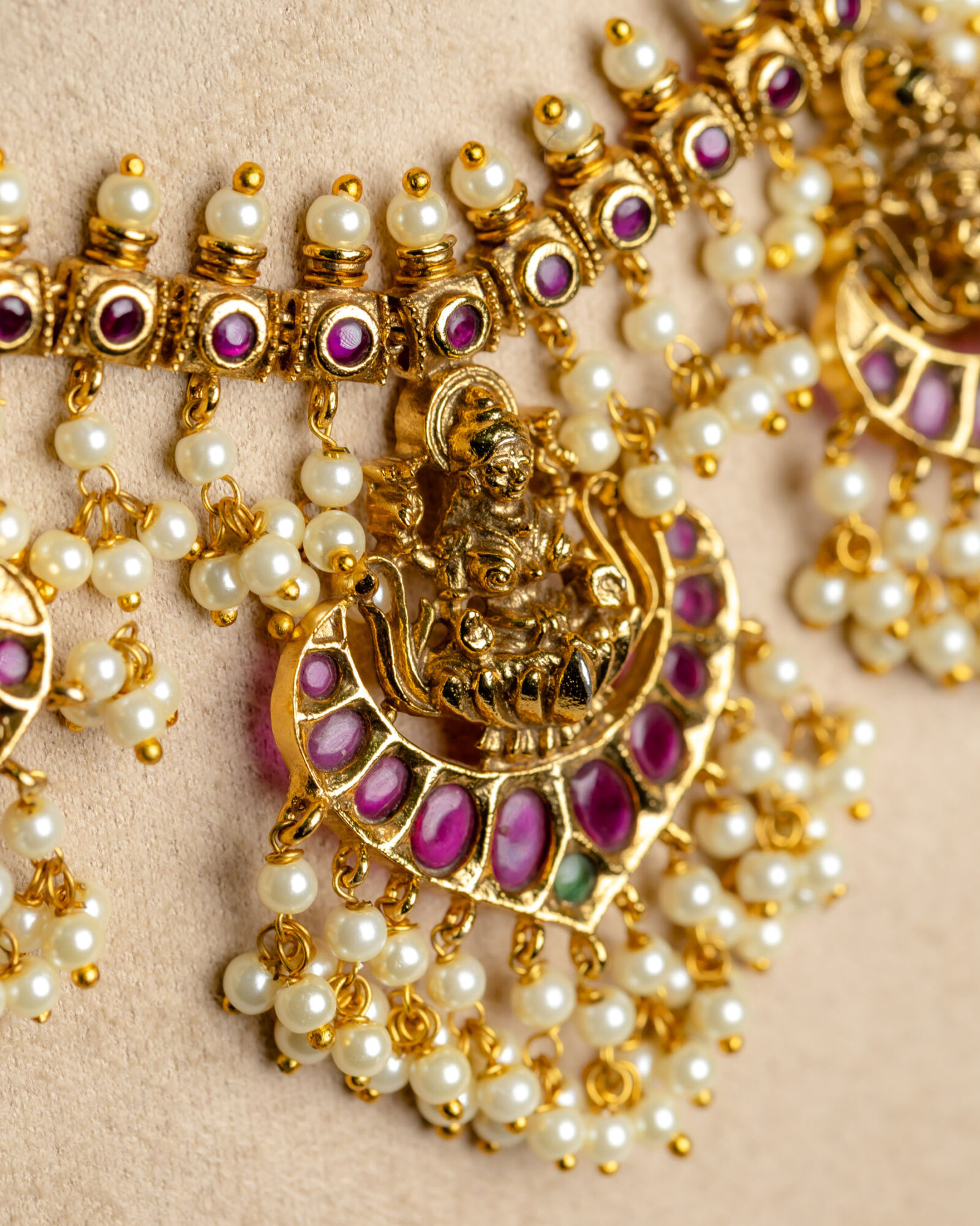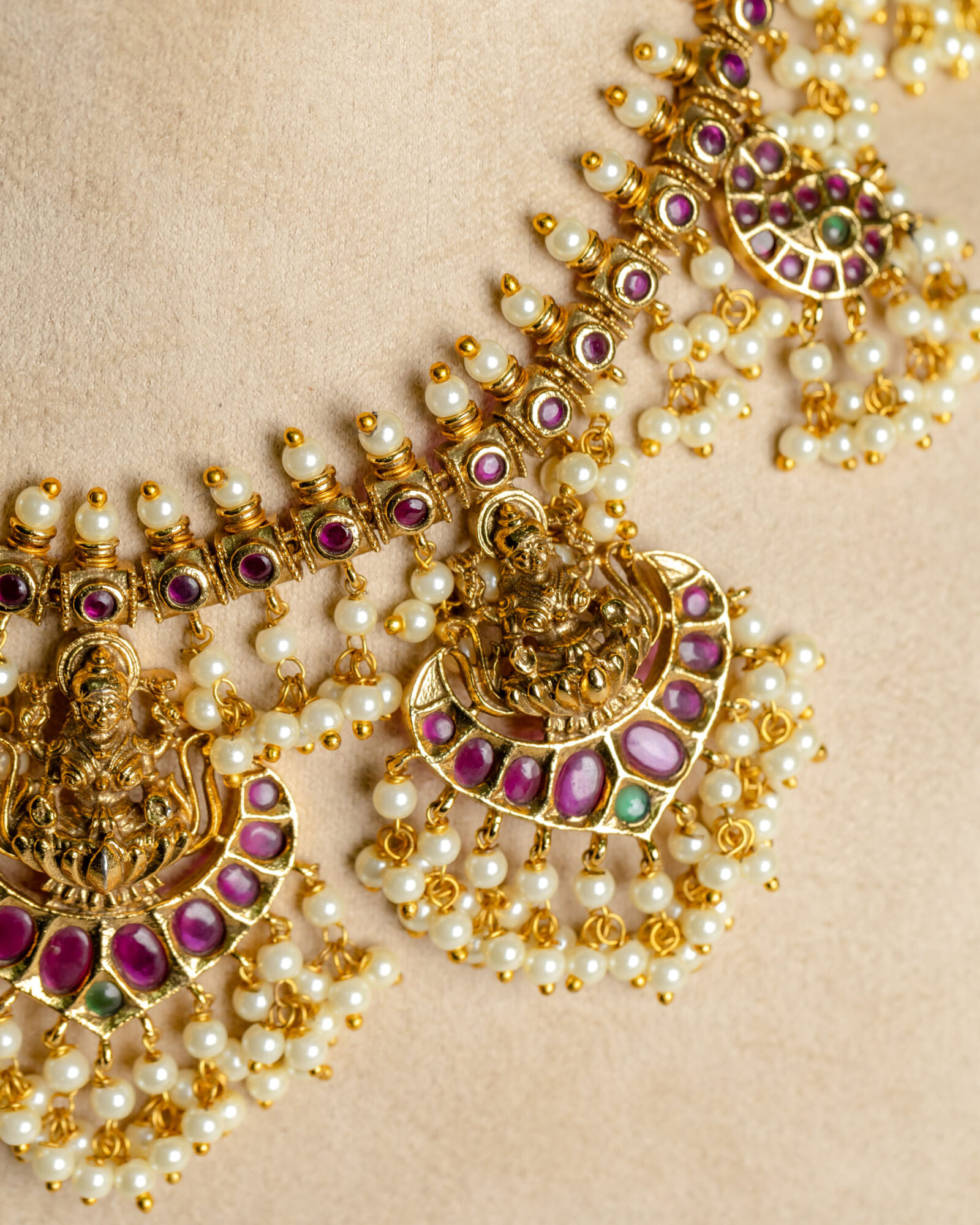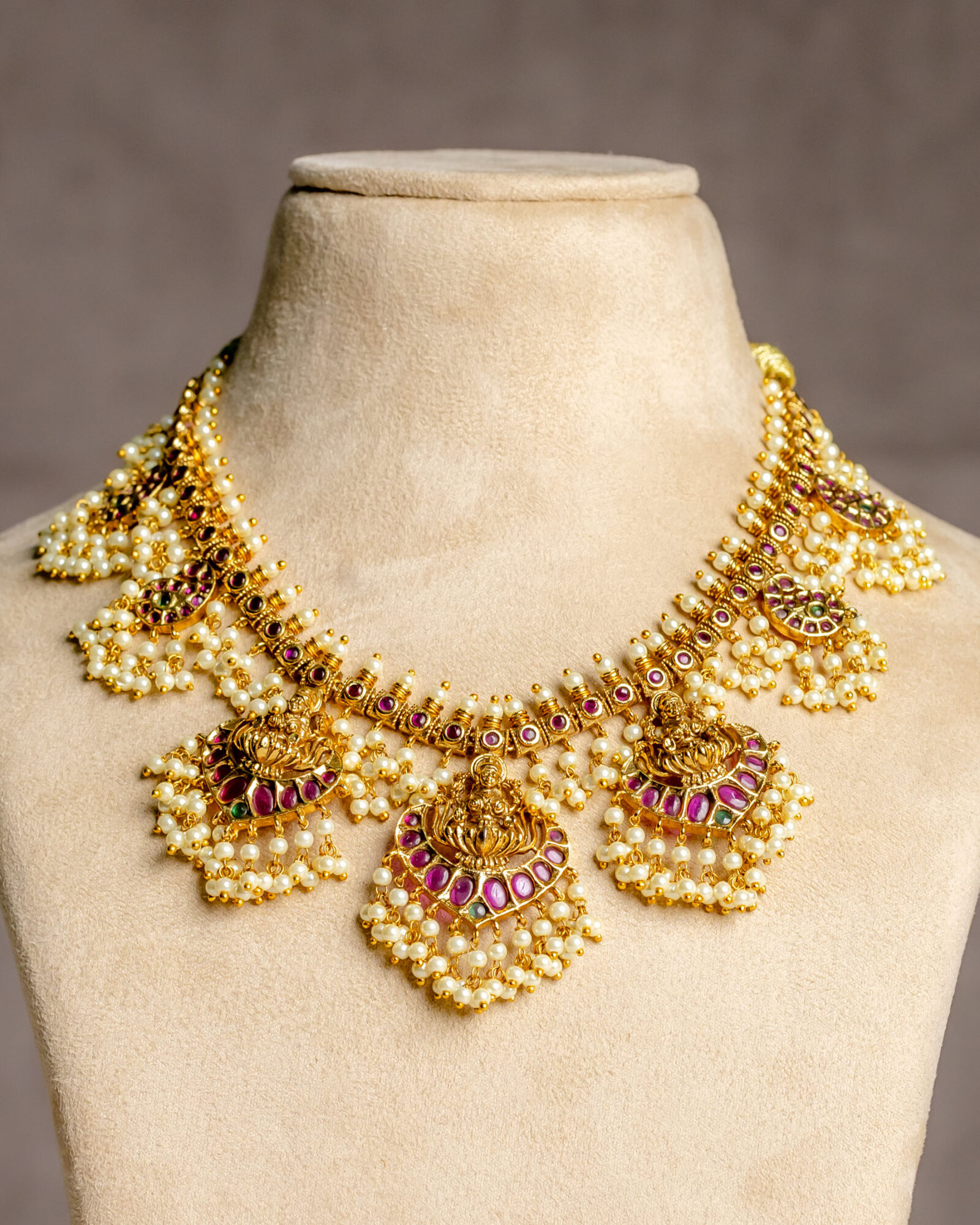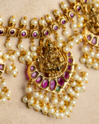 This antique pearl cluster necklace is meticulously designed with classic details that are bound to captivate – Goddess Lakshmi is exquisitely depicted atop lotus motifs on ruby red stones.